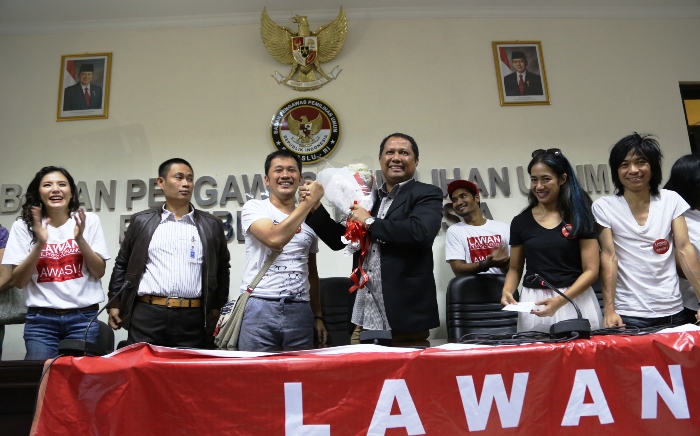 Jakarta, Badan Pengawas Pemilu - Para artis musisi dan sineas ibukota yang tergabung dalam “Suara Masyarakat Indonesia untuk Pilpres Jujur” mengadakan konferensi pers di Media Center Bawaslu RI (8/7). Hadir dalam acara tersebut anggota Bawaslu RI, Nasrullah dan sejumlah artis seperti Ratna Sarumpaet, Hanung Bramantyo, Olga Lydia, Abdee Negara, Indra Bekti dan beberapa artis lainnya. Mereka datang ingin menyampaikan keprihatinannya atas pelaksanaan Pemilihan Umum Presiden pada 9 Juli besok.