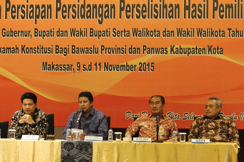 Makassar, Badan Pengawas Pemilu- Penutupan pembekalan persiapan persidangan Perselisihan Hasil Pemilihan Kepala Daerah bagi Bawaslu Provinsi dan Panwas Kabupaten/Kota kali ini terasa istimewa. Tiga ketua lembaga penyelengara Pemilu, Muhammad (ketua Bawaslu RI), Husni Kamil Manik (Ketua KPU RI) dan Jimly Asshiddiqie (ketua DKPP) dan Gunawan Suswantoro (Sekretaris Jenderal Bawaslu) turut hadir dalam kegiatan tersebut, Selasa malam, (10/11).