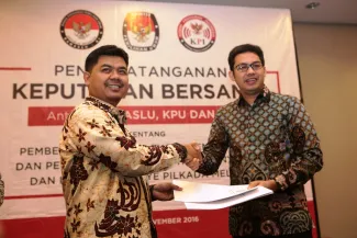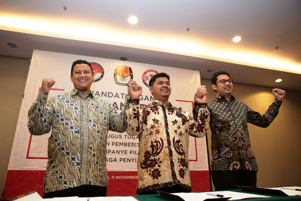Jakarta, Badan Pengawas Pemilu - Badan Pengawas Pemilu Republik Indonesi (Bawaslu RI), Komisi Pemilihan Umum (KPU), dan Komisi Penyiaran Indonesia (KPI) menandatangani Memorandum Of Understanding (MoU) kesepakatan bersama Pilkada  melalui lembaga penyiaran. Jumat (11/11). Penandatanganan tersebut disepakati melalui pembentukan Gugus Tugas Pengawasan dan Pemantauan Pemberitaaan Penyiaran dan Iklan Kampanye Pilkada 2017.