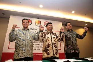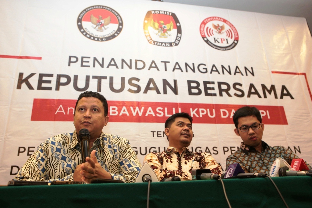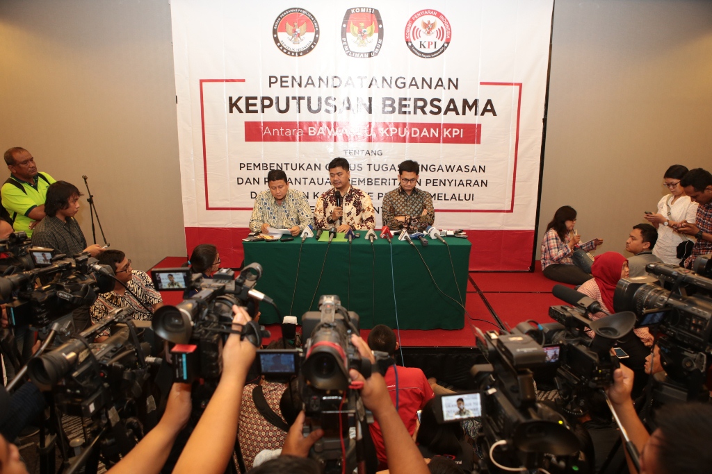 Hadir dalam penandatanganan kesepakatan bersama tiga lembaga, Ketua Bawaslu Muhammad, Ketua KPU Juri Ardiantoro dan Ketua KPI Yuliandre Darwis. (Humas)