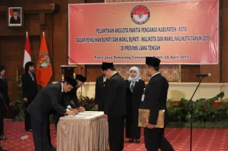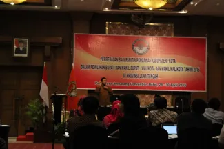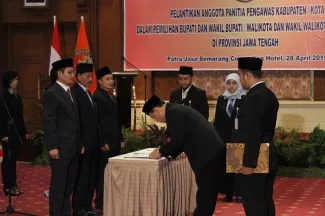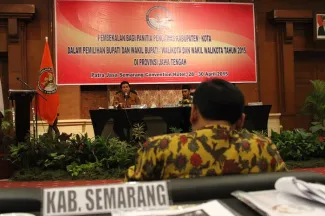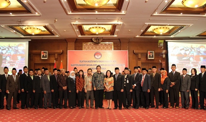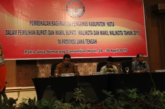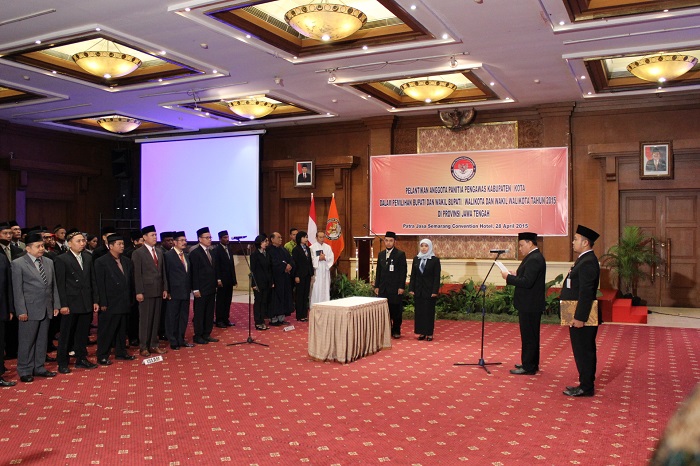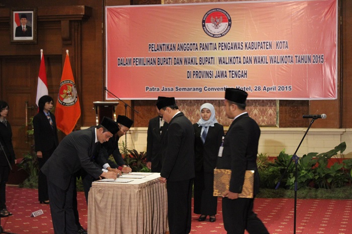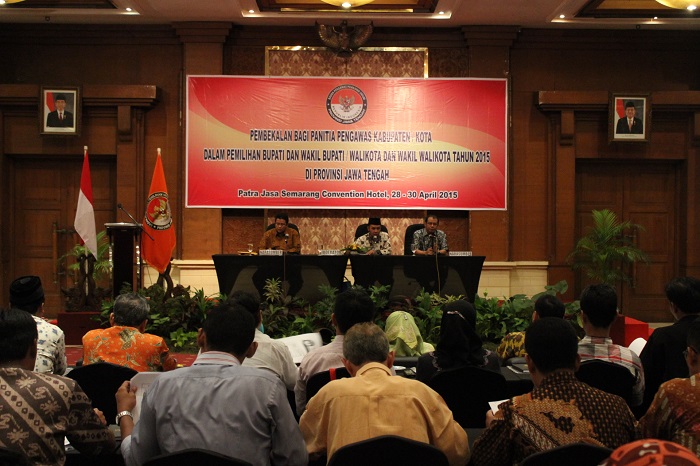 Semarang, Badan Pengawas Pemilu. Ketua Bawaslu RI Prof. Muhammad menghadiri pelantikan serta pembekalan 63 Anggota Panitia Pengawas Pemilu (Panwaslu) di 21 Kabupaten/Kota Provinsi Jawa Tengah dalam rangka menghadapi Pemilihan Bupati dan Wakil Bupati serta Walikota dan Wakil Walikota bertempat di Patra Jasa Semarang Convention Hotel, Selasa (28/4). Adapun 21 daerah di Jateng yang akan melaksanakan pilkada pada 2015 itu adalah Kota Pekalongan, Kota Semarang, Kabupaten Rembang, Kabupaten Purbalingga, Kabupaten Kebumen, Kota Surakarta, Kabupaten Boyolali, Kabupaten Kendal, Kota Magelang, Kabupaten Sukoharjo, Kabupaten Semarang, Kabupaten Purworejo, Kabupaten Wonosobo, Kabupaten Wonogiri, Kabupaten Klaten, Kabupaten Blora. Kemudian, Kabupaten Grobogan, Kabupaten Sragen, Kabupaten Demak, Kabupaten Pekalongan, dan Kabupaten Pemalang.