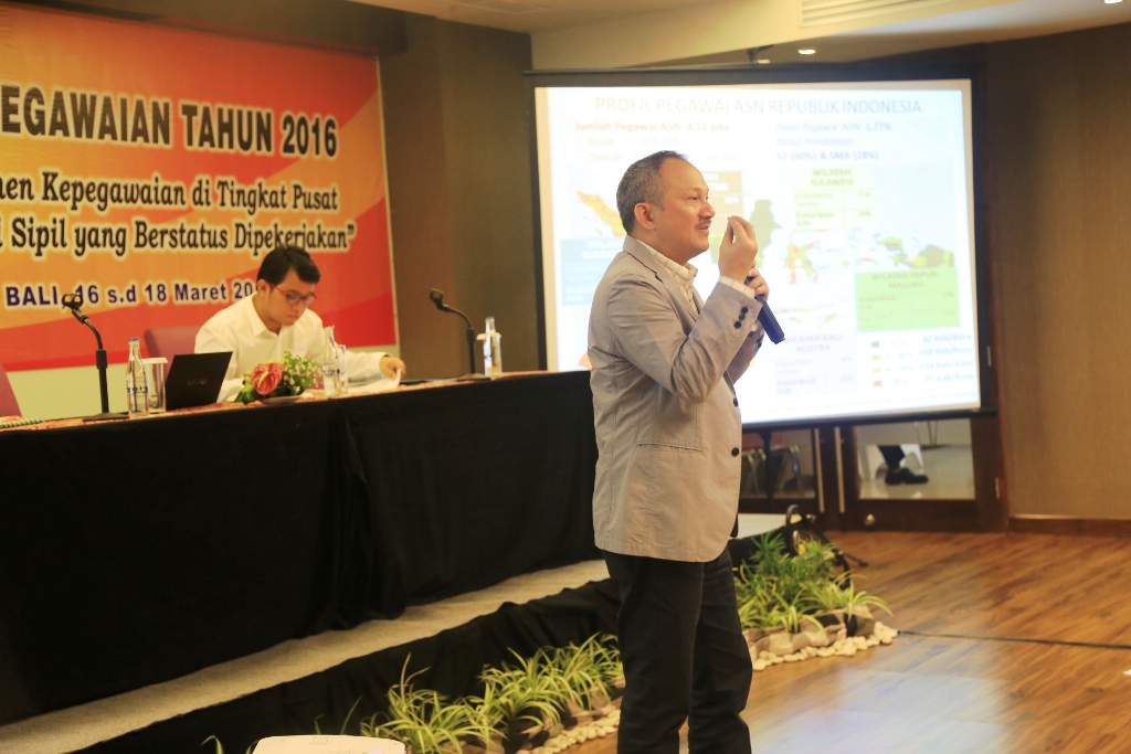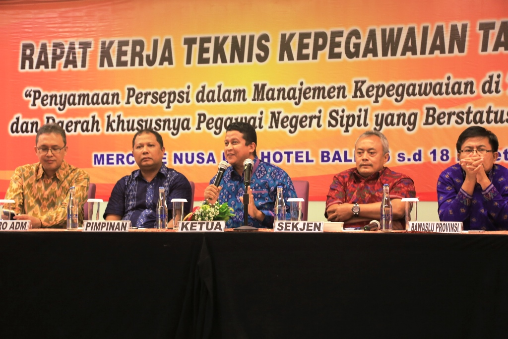 Bali, Badan Pengawas Pemilihan Umum -- Bagian Sumber Daya Manusia dan Tata Usaha Pimpinan Bawaslu RI menggelar Rapat Kerja Teknis Kepegawaian Tahun 2016 dengan tema ‘Penyamaan Persepsi dalam Manajemen Kepegawaian di Tingkat Pusat dan Daerah khususnya Pegawai Negeri Sipil yang berstatus Dipekerjakan’, di Hotel Mercure Nusa Dua, Bali, pada Rabu (16/3) hingga Kamis (17/3). Rakernis Kepegawaian Tahun 2016 dihadiri pimpinan Bawaslu, Sekretaris Jenderal Bawaslu RI Gunawan Suswantoro, pejabat struktural di Sekretariat Jenderal Bawaslu serta Kepala Sekretariat Bawaslu Provinsi. Dari pihak eksternal, hadir perwakilan dari BKD seluruh provinsi dan wakil dari Kemenpan RB dari seluruh regional.
