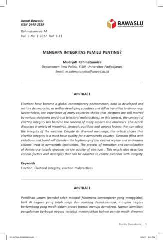 Abstrak : Pemilihan umum (pemilu) telah menjadi fenomena kontemporer yang mengglobal, baik di negara yang telah maju dan matang demokrasinya, maupun negara berkembang yang masih dalam proses transisi menuju demokrasi. Namun demikian, pengalaman berbagai negara tersebut menunjukkan bahwa pemilu masih diwarnai oleh berbagai pelanggaran dan kecurangan (electoral malpractices). Dalam konteks inilah, konsep integritas pemilu menjadi perhatian banyak ahli dan pengamat. Artikel ini mendiskusikan beragam pemaknaan, posisi strategis dan beragam faktor yang dapat mempengaruhi integritas pemilu. Terlepas dari pemaknaannya yang beragam, artikel ini menunjukkan bahwa integritas pemilu merupakan kualitas yang harus dimiliki untuk sebuah negara demokrasi