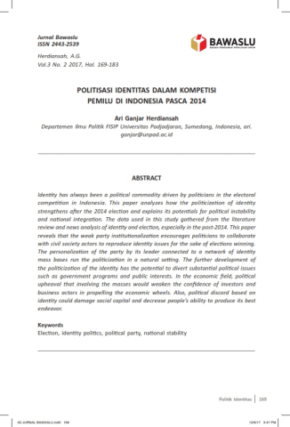 Abstrak : Identitas senantiasa menjadi komoditas politik yang digulirkan oleh para politikus dalam pertarungan pemilu di Indonesia. Tulisan ini menganalisis bagaimana politisasi identitas menguat pasca pemilu 2014 dan menjelaskan potensi-potensinya terhadap instabilitas politik dan integrasi bangsa. Data-data yang digunakan berasal dari kajian pustaka dan analisis berita-berita terkait dengan pemilu dan identitas, terutama pasca 2014. Tulisan ini mengungkapkan bahwa lemahnya institusionalisasi partai mendorong para politisi berkolaborasi dengan aktor-aktor civil society untuk mereproduksi isu-isu identitas demi kepentingan pemilu. Personalisasi partai oleh figur pemimpinnya yang terhubung dengan jejaring basis massa berdasarkan identitas menjadikan politisasi identitas seolah-olah berjalan alamiah. Perkembangan politisasi identitas lebih lanjut berpotensi mengalihkan persoalan politik substansial seperti program pemerintah dan kepentingan publik. Di bidang ekonomi, kegaduhan politik yang melibatkan massa akan melemahkan kepercayaan investor dan pelaku usaha dalam menggerakkan roda perekonomian. Selain itu, pertentangan politik berdasarkan identitas dapat merusak modal sosial dan menurunkan kapasitas masyarakat dalam menghasilkan pencapaian terbaiknya.