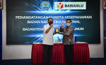 Jakarta, Badan Pengawas Pemilihan Umum - Bawaslu melakukan penandatanganan nota kesepahaman dengan Badan Narkotika Nasional Republik Indonesia (BNN). Penandatanganan dilakukan oleh Ketua Bawaslu Abhan dengan Kepala BNN Heru Winarko di Gedung BNN, Cawang, Jakarta Timur, Selasa (28/7/2020).