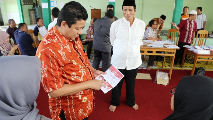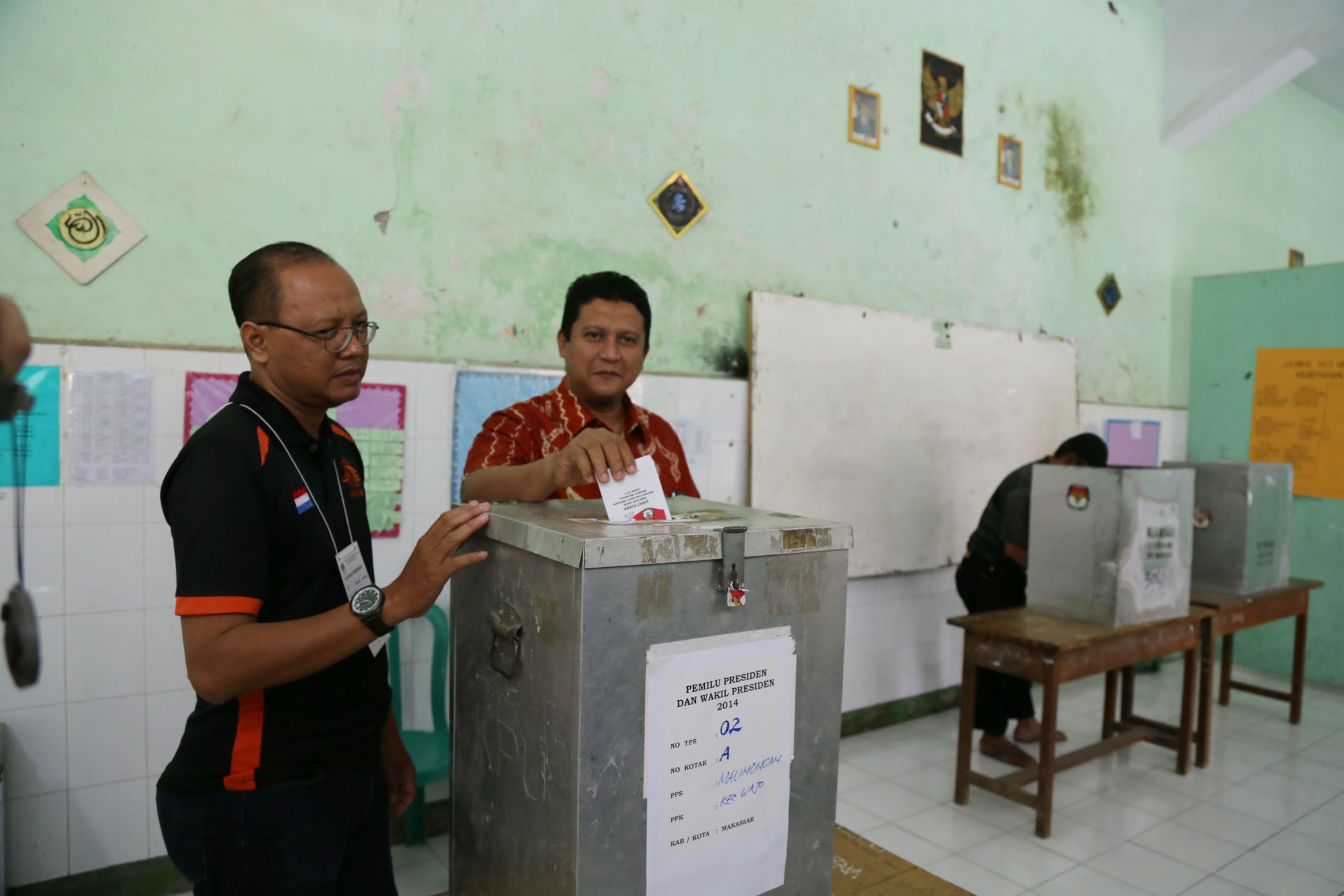 Ketua Bawaslu RI, Muhammad pagi tadi tepat pukul 10.00 WITA memberikan hak suaranya di Tempat Pemungutan Suara (TPS) 02 Kelurahan Malimongan, Kecamatan Wajo, Kota Makassar, Sulawesi Selatan, Rabu (9/7). Pelaksanaan pemungutan suara pada Pemilihan Umum Presiden dan Wakil Presiden Tahun 2014 (Pilpres) ini berlangsung dalam suasana akrab penuh silaturahmi antar Ketua Bawaslu dan masyarakat di lokasi TPS tersebut.