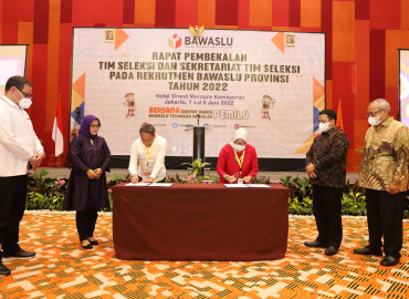 Jakarta, Badan Pengawas Pemilihan Umum - Sebanyak 125 orang secara sah melaksanakan tugas sebagai tim seleksi (timsel) Anggota Bawaslu Provinsi setelah mendapatkan pembekalan dan menandatangani pakta integritas di Jakarta, Rabu (8/6/2022) malam. Nantinya para timsel akan bekerja selama tiga bulan dalam proses penjaringan di 25 provinsi yang habis masa tugas tahun 2022.