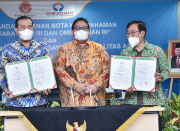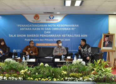 Jakarta, Badan Pengawas Pemilihan Umum - Ketua Bawaslu Rahmat Bagja menyaksikan penandatangan nota kesepahaman (memorandum of understansing/MoU) antara Komisi Aparatur Sipil Negara (KASN) dan Ombudsman RI dalam meningkatkan pengawasan penyelenggaraan pelayanan publik sekaligus manajemen ASN berbasis sistem merit.