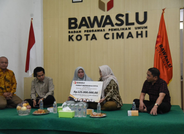 Kota Cimahi, Badan Pengawas Pemilihan Umum- Anggota Bawaslu Lolly Suhenty menyerahkan santunan dana kerahiman kepada keluarga salah satu staf Bawaslu Kota Cimahi. Almarhum Doni Irwanjono dikenal sebagai sosok pekerja keras dan staf yang selalu siap sedia dalam mendukung tugas-tugas pengawasan pemilu.