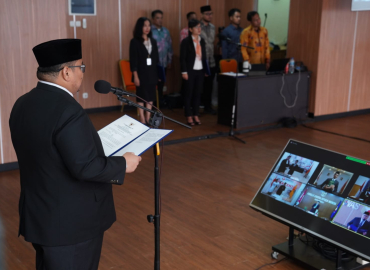 Jakarta, Badan Pengawas Pemilihan Umum - Ketua Bawaslu Rahmat Bagja melantik dan mengambil sumpah atau janji anggota dan penggantian antar-waktu (PAW) Bawaslu Kabupaten/Kota 2023-2028 serta Panitia Pengawas Pemilu (Panwaslu) Luar Negeri (LN) di Kantor Bawaslu, Jakarta secara dalam jaringan (daring) Sabtu (13/1/2024).