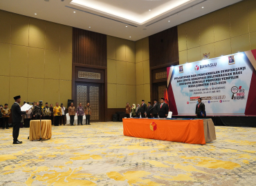 Jakarta, Badan Pengawas Pemilihan Umum- Ketua Bawaslu Rahmat Bagja melantik sekaligus mengambil sumpah janji 72 Anggota Bawaslu dari 28 Provinsi. Dalam amanatnya dia meminta para terlantik untuk bekerja sesuai aturan Undang Undang dalam menghadapi tahapan Pemilu Serentak 2024 yang semakin krusial.
