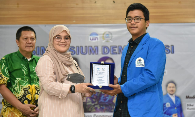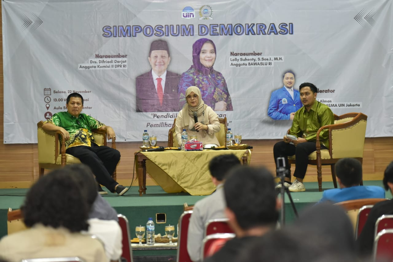 Anggota Bawaslu Lolly Suhenty menjadi narasumber dalam Simposiun Demokrasi: Pendidikan Pengawasan Pemilu di Aula Student Center UIN Syarif Hidayatullah Jakarta, Selasa (22/11/2022). Foto: Publikasi dan Pemberitaan Bawaslu RI