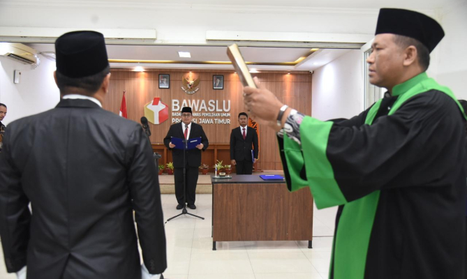 Surabaya, Badan Pengawas Pemilihan Umum- Ketua Bawaslu Rahmat Bagja melantik sekaligus mengambil sumpah Pengganti Antar-waktu (PAW) tiga anggota Bawaslu. Dia meminta para terantik untuk segera bekerja serta berkoordinasi dengan lembaga terkait, mengingat sebentar lagi akan memasuki tahapan pemungutan suara Pemilihan 2024.