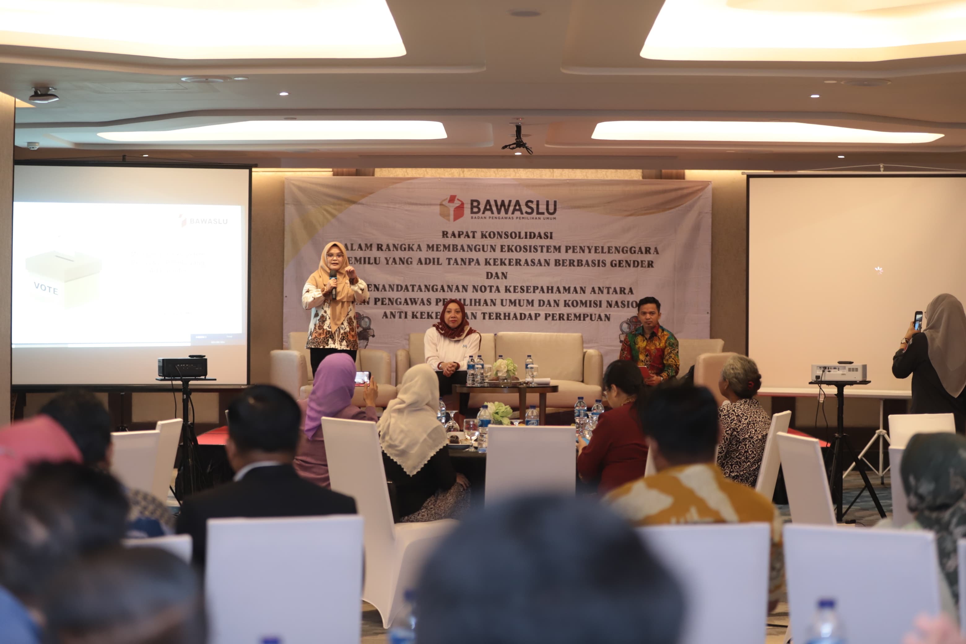 Anggota Bawaslu Lolly Suhenty (kiri depan) memberi arahan dalam Rapat Konsolidasi dalam Rangka Membangun Ekosistem Penyelenggara Pemilu yang Adil tanpa Kekerasan Berbasis Gender di Jakarta, Senin (10/6/2024)/foto: Publikasi dan Pemberitaan Bawaslu.