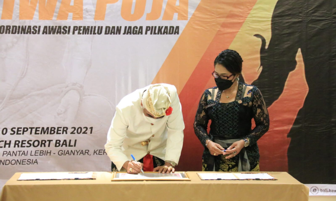 Gianyar, Badan Pengawas Pemilihan Umum - Bawaslu Provinsi Bali melakukan penandatanganan nota kesepakatan bersama Majelis Desa Adat (MDA) sekaligus peluncuran program Gerakan Masyarakat Adat Terkoordinasi Awasi Pemilu dan Jaga Pilkada (Gema Siwa Puja), Jumat (10/9/2021). Ketua Bawaslu Provinsi Bali Ketut Ariyani mengatakan Program tersebut merupakan salah satu upaya Bawaslu Provinsi Bali agar masyarakat adat turut berpartisipasi dalam pengawasan pemilu ataupun pilkada mendatang.