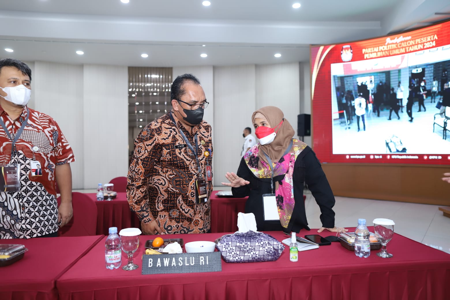 Anggota Bawaslu Lolly Suhenty didampingi Deputi Bidang Dukungan Teknis La Bayoni mengawasi proses pendaftaran dan verifikasi partai politik di KPU RI, Jakarta/ foto: pemberitaan dan dokumentasi