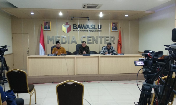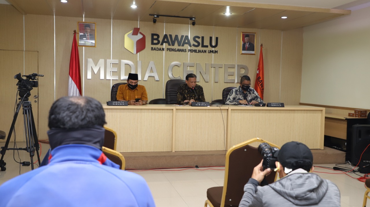 Pimpinan Bawaslu (kiri ke kanan): M Afifuddin, Abhan, dan Fritz Edward Siregar saat memberikan keterangan pers di Media Center Bawaslu, Jakarta, Senin 15 Juni 2020/Foto: Humas Bawaslu RI