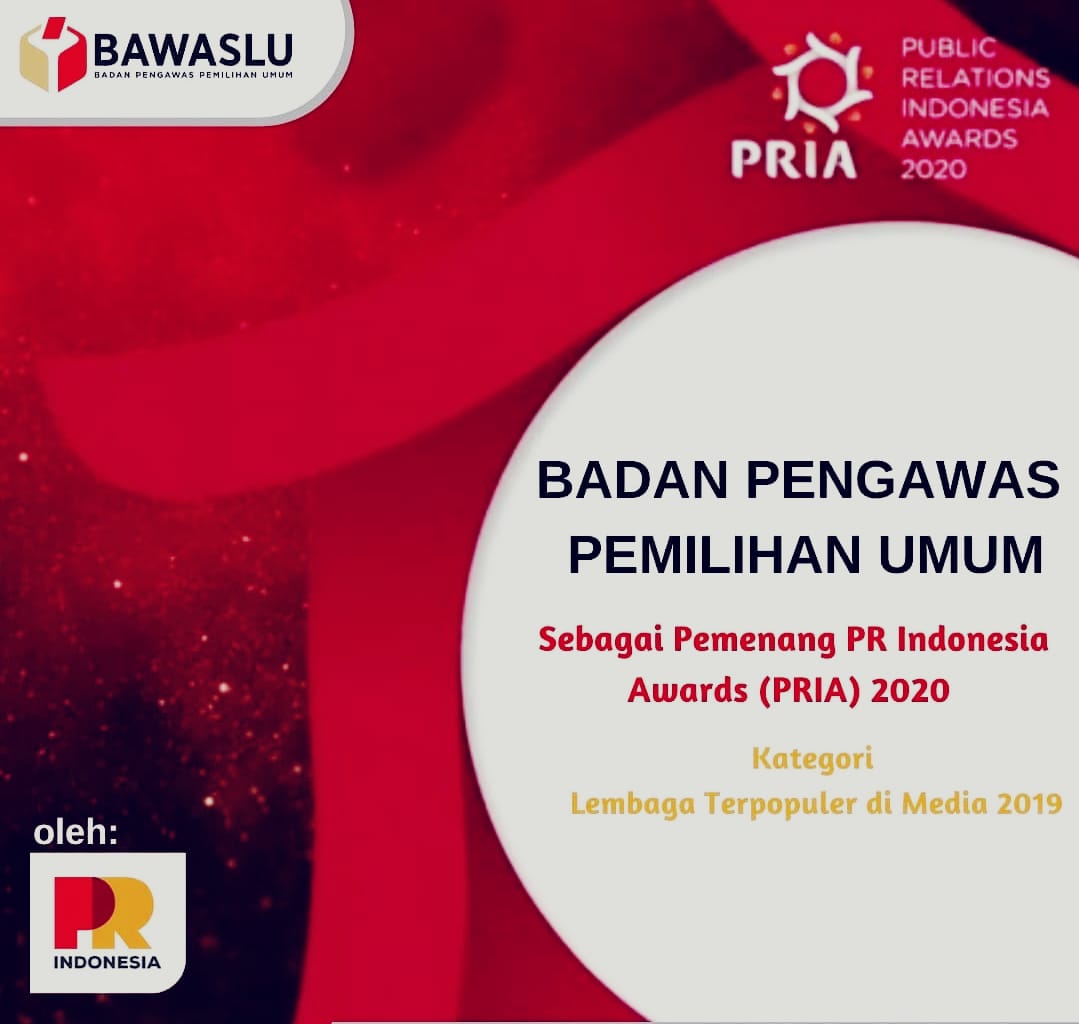 Jakarta, Badan Pengawas Pemilihan Umum - Bawaslu kembali meraih penghargaan Public Relation Indonesia Award (PRIA) 2020 untuk kali ketiga secara tiga tahun berturut-turut. Kali ini, Bawaslu mendapatkan kategori 'The Most Popular in Media (lembaga terpopuler di media). Pemberian apresiasi tersebut diberikan oleh Public Relations (PR) Indonesia sebagai penyelenggara PRIA 2020 yang merupakan ajang kompetisi kehumasan yang dilaksanakan setiap tahun.