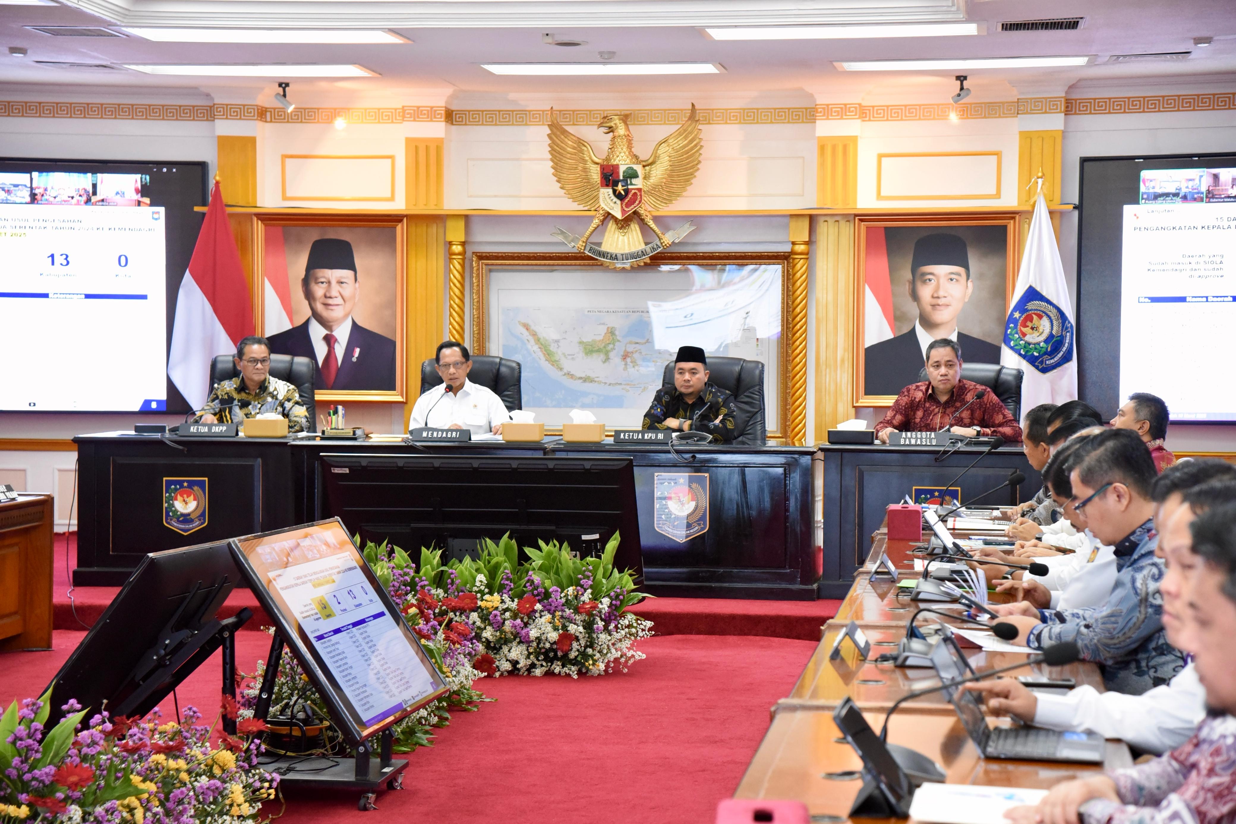 Suasana Rapat Koordinasi Pilkada Ulang dan Pemungutan Suara Ulang (PSU) terkait Hasil Pemilihan Kepala Daerah Serentak Tahun 2024 di Ruang Sidang Utama Kementerian Dalam Negeri (Kemendagri), Jumat, (21/3/2025).