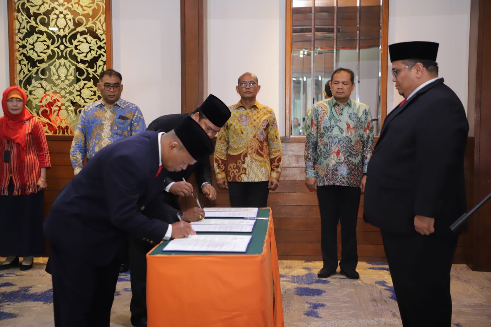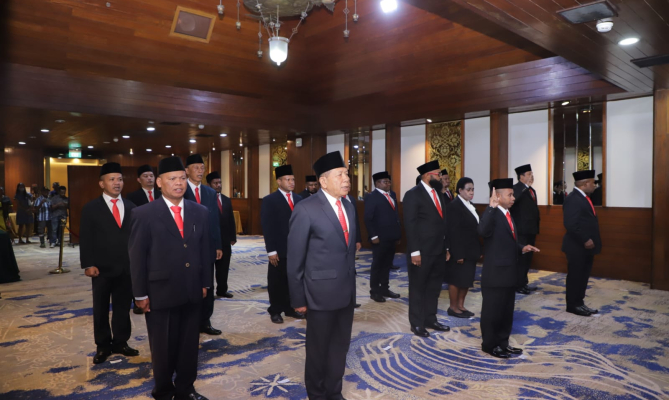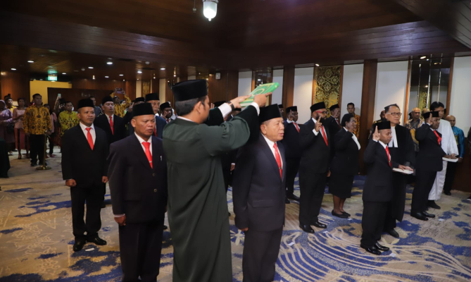 Jakarta, Badan Pengawas Pemilihan Umum - Ketua Bawaslu Rahmat Bagja melantik sekaligus mengambil sumpah janji anggota Bawaslu Papua dan Tiga Bawaslu Daerah Otonom Baru (DOB); Papua Selatan, Papua Tengah dan Papua Pegunungan periode 2023-2028. Dia meminta para terlantik harus menjadi pribadi yang kuat dan berani.