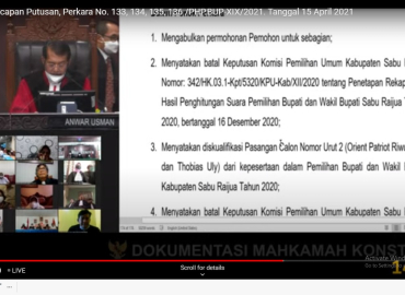 Jakarta, Badan Pengawas Pemilihan Umum - Mahkamah Konstitusi (MK) membatalkan penetapan rekapitulasi hasil keputusan KPU Sabu Raijua pemilihan bupati dan wakil bupati Sabu Raijua tahun 2020. MK pun memerintahkan KPU melakukan pemungutan suara ulang tanpa pasangan calon (paslon) nomor urut 2 yakni Orient Patriot Riwu Kore dan Thobias Uly.