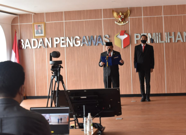 Jakarta, Badan Pengawas Pemilihan Umum - Ketua Bawaslu Abhan melakukan pengambilan sumpah pergantian antarwaktu (PAW) Anggota Bawaslu Kabupaten Minahasa Utara (Minut) sisa masa jabatan 2021-2022. Aljunaid Bakari dilantik menjadi salah satu dari tiga pimpinan Bawaslu Kabupaten Minut menggantikan Rahman Ismail.