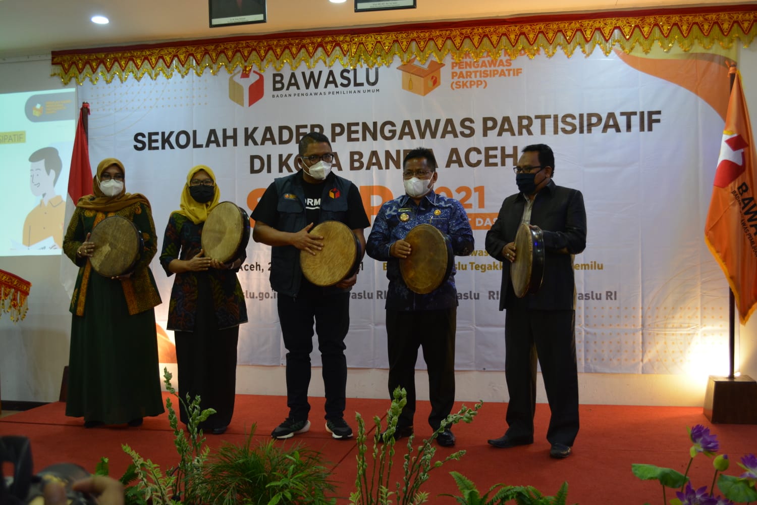 SKPP Banda Aceh diresmikan oleh Fritz Edward Siregar dengan menabuhkan rapai Seurune kale/foto: Humas Panwaslih Aceh