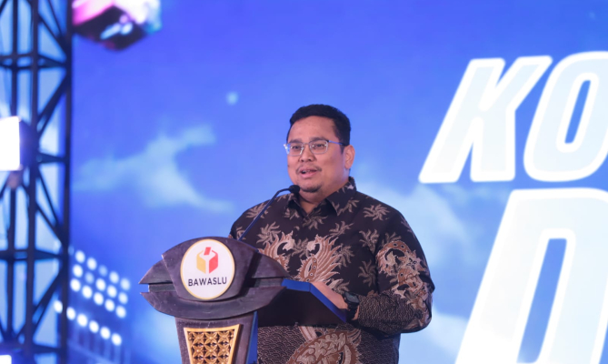 Ketua Bawaslu Rahmat Bagja memberikan sambutan dalam Kompetisi Debat Penegakkan Hukum Pemilu tahun 2024 di Jakarta, Sabtu malam, (19/10/2024)/foto: Publikasi dan Pemberitaan Bawaslu