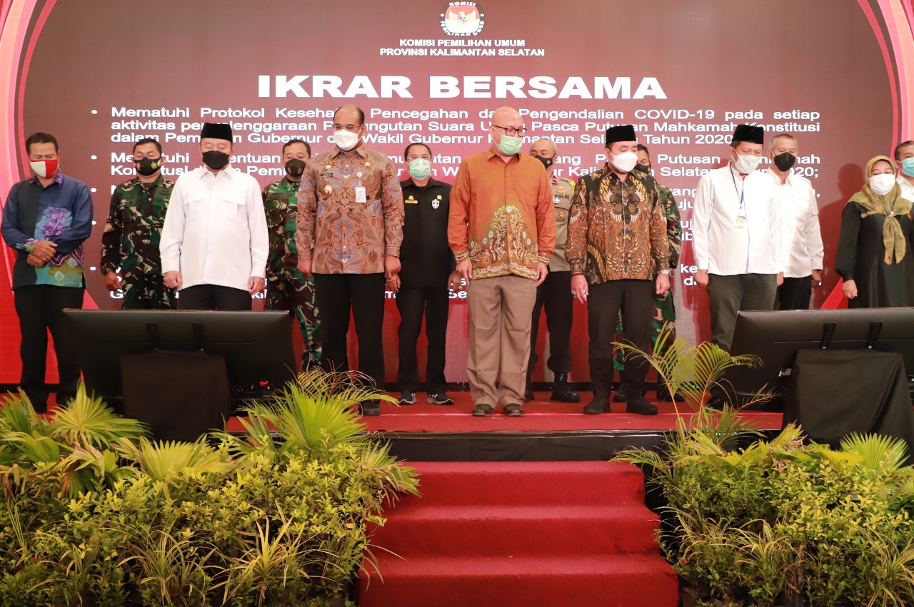 Anggota Bawaslu Mochammad Afifuddin beserta Ketua KPU RI Ilham Saputra, Bawaslu Kalsel, Polda Kalsel, TNI 101 Antasari, Pj. Gubernur Kalsel Safrizal ZA, juga dari Kedua Pasangan Calon Gubernur dan Wakil Gubernur Provinsi Kalimantan Selatan saat ikrar PSU damai dilakukan di Banjarmasin, Kalsel, Kamis (20/5/2021)/ Foto : Isya (Humas Bawaslu Kalsel)