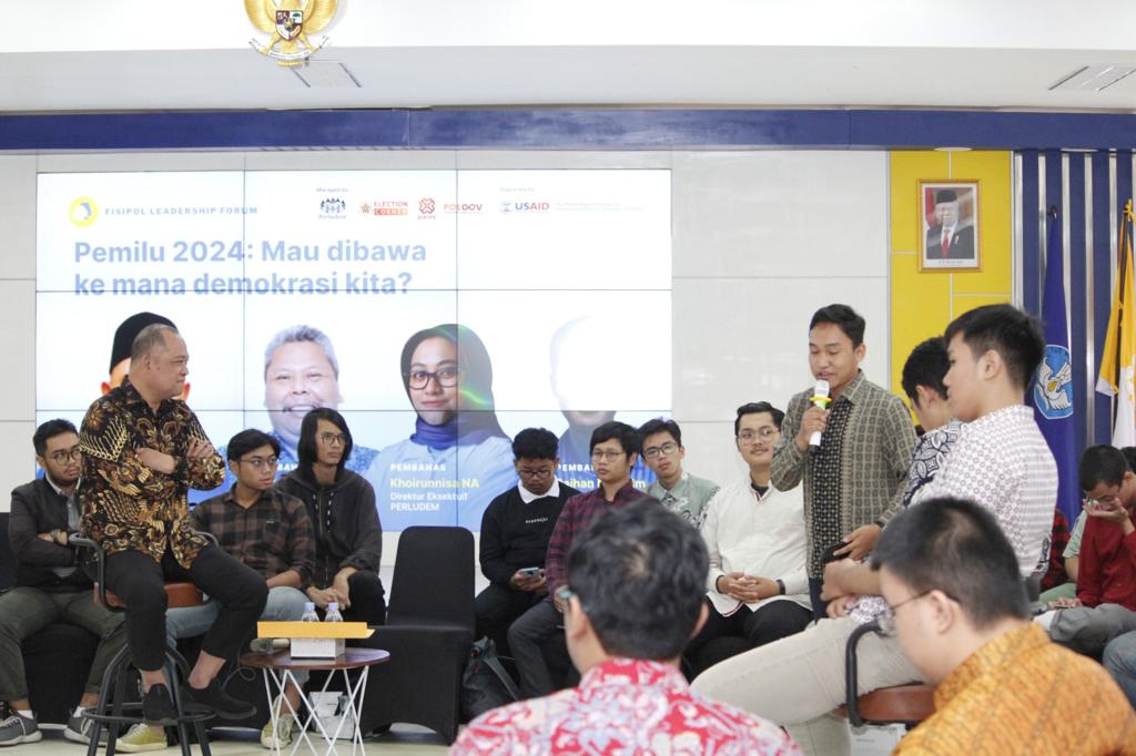 Anggota Bawaslu Totok Hariyono berdiskusi dengan mahasiwa dalam acara Fisipol Leadership Forum yang diselenggarakan FISIPOL UGM, Kamis (31/8/2023).