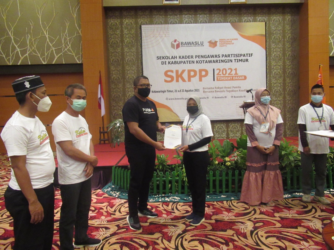 Anggota Bawaslu Republik Indonesia Fritz Edward Siregar menyerahkan cinderamata pada kader SKPP Tingkat Dasar, Kotawaringin Timur, Kalimantan Tengah, Senin (23/8/2021)/ Foto : Oktavian Cakra (Humas Bawaslu Kotawaringin Timur).