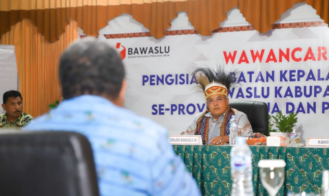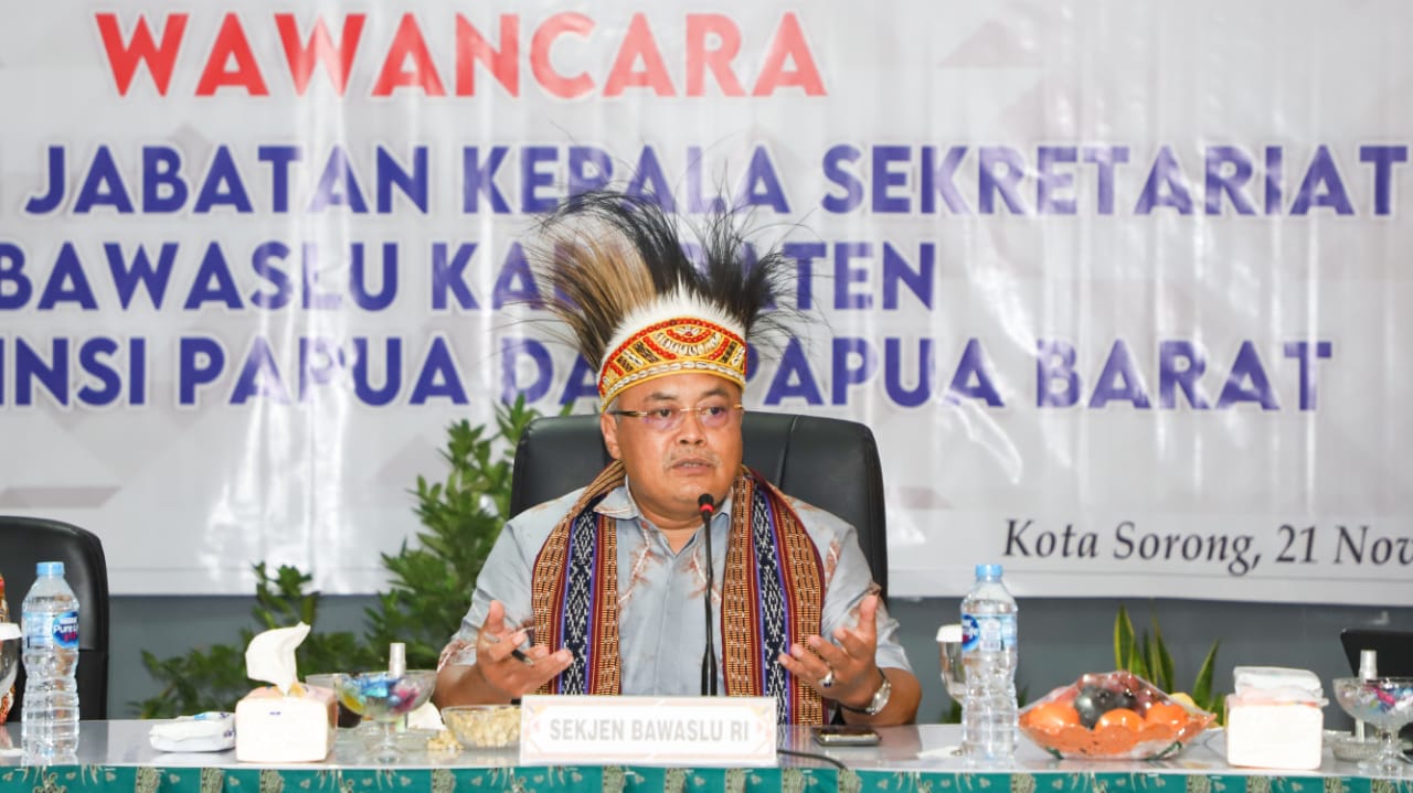 Sorong, Badan Pengawas Pemilihan Umum – Sekretaris Jenderal Bawaslu Republik Indonesia Gunawan Suswantoro melakukan seleksi jabatan bagi Kepala Sekretariat (Kasek) Bawaslu Kabupaten/Kota dengan metode Job Fit. Dalam kesempatan ini, Gunawan mengharapkan calon Kasek tidak hanya mengerti soal keuangan saja namun berbagai hal di dalamnya.