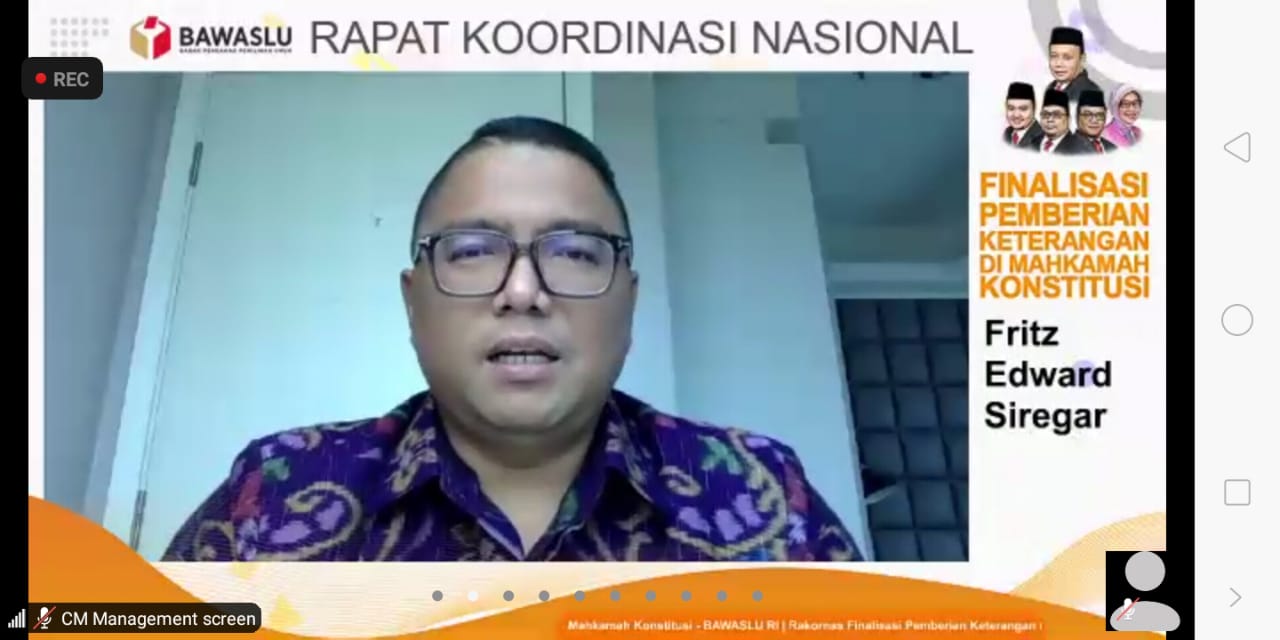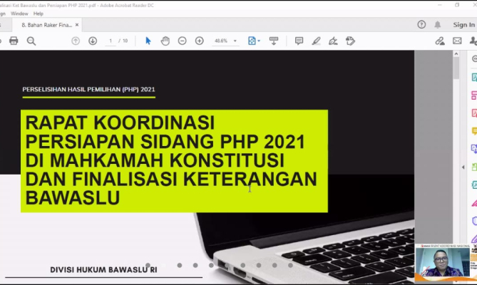 Jakarta, Badan Pengawas Pemilihan Umum – Jelang menghadapi proses sidang perselisihan hasil pemilihan kepala daerah 2020 (PHP) pilkada di Mahkamah Konstitusi (MK), Bawaslu menggelar Rapat Koordinasi Nasional (Rakornas) Finalisasi Pemberian Keterangan Tertulis melalui Zoom, Sabtu (23/01/2020).