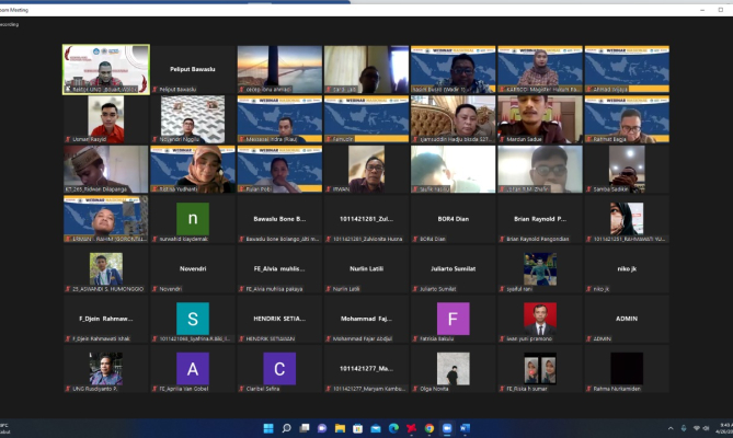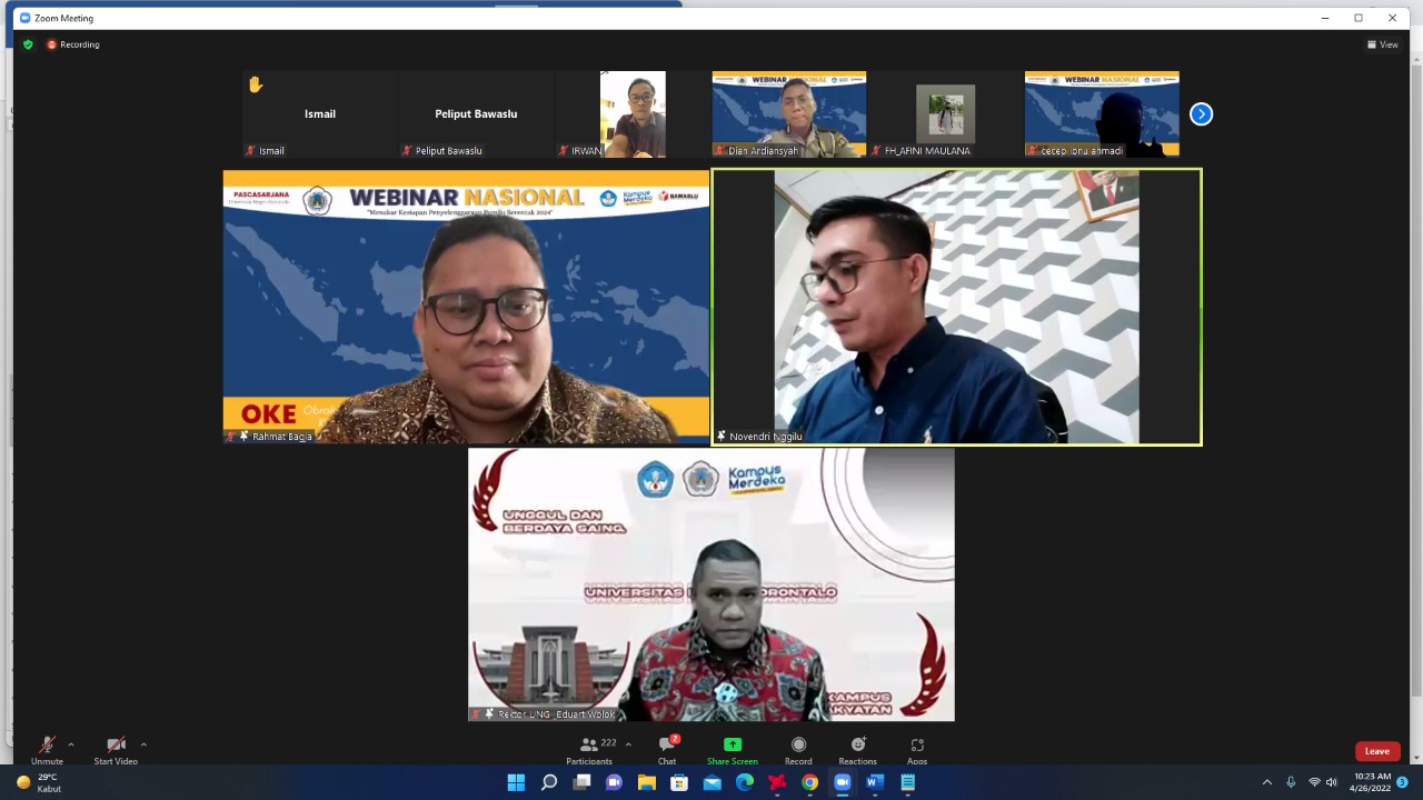 Ketua Bawaslu Rahmat Bagja (kiri atas) menjadi pembicara utama dalam webinar bertajuk 'Menakar Kesiapan Penyelenggaraan Pemilu Serentak 2024' bersama Universitas Negeri Gorontalo, Selasa (26/4/2022)/foto: Publikasi dan Pemberitaan Bawaslu.