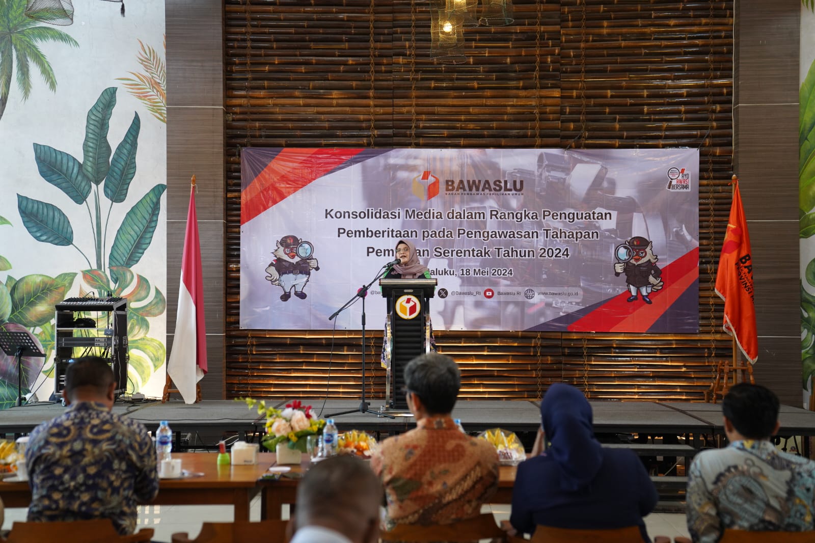 Anggota Bawaslu Lolly Suhenty (di tengah mimbar) saat memberikan sambutan dalam Konsolidasi Media dalam Rangka Penguatan Pemberitaan pada Pengawasan Tahapan Pemilihan Serentak 2024, di Provinsi Maluku, Sabtu, (18/5/2024).