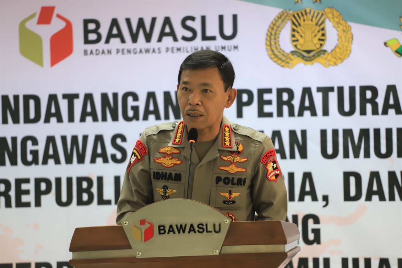 Kapolri Jenderal Idham Aziz saat memberikan sambutan dalam penandatanganan Peraturan Bersama antara Bawaslu, Kejaksaan Agung, dan Polri di Ruang Rapat Lantai 4 Bawaslu, Jakarta, Senin 20 Juli 2020/Foto: Humas Bawaslu RI