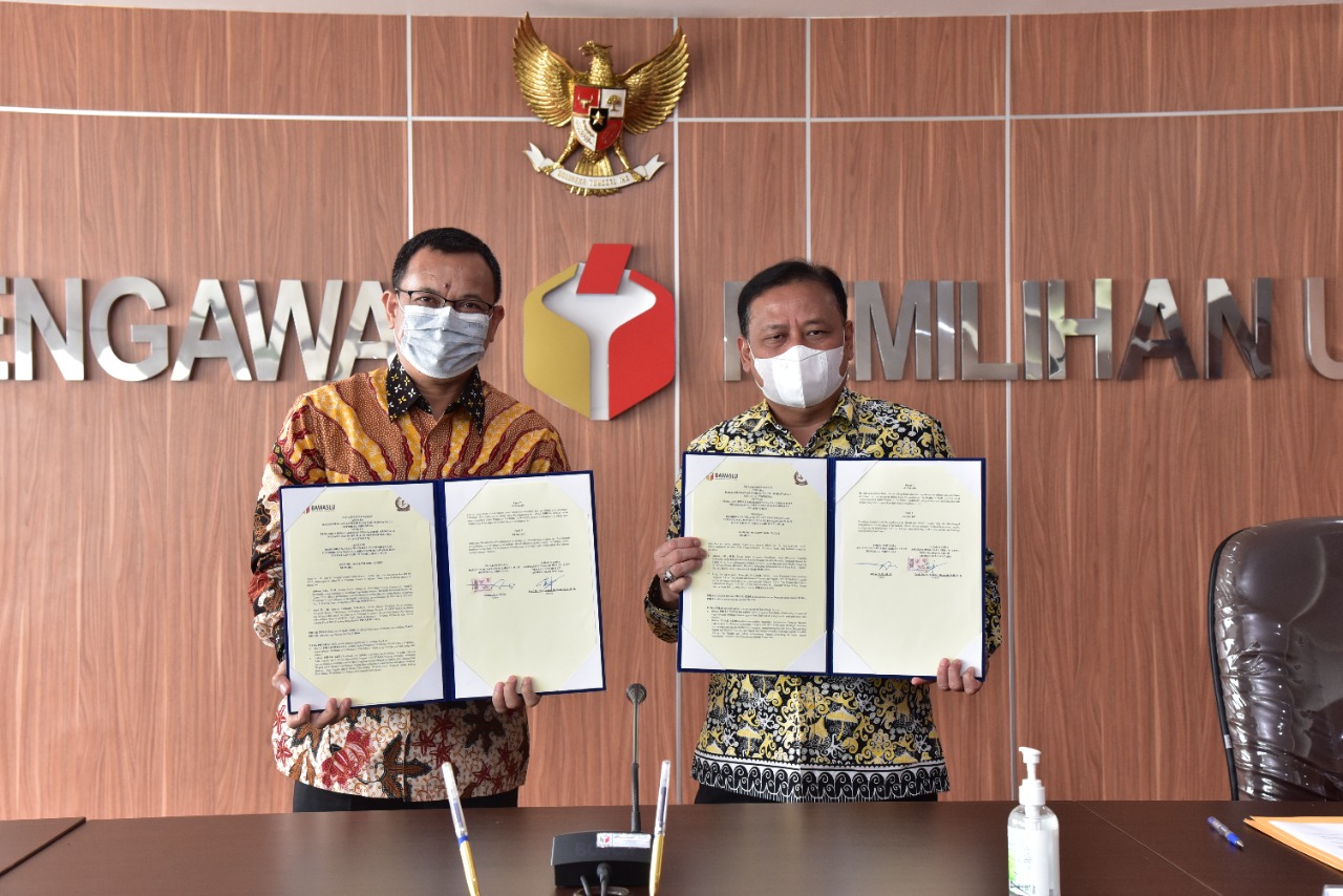 Ketua Bawaslu Abhan (kanan) dan Ketua APHTN-HAN Guntur Hamzah (kiri) memperlihatkan nota kesepahaman antara Bawaslu-APHTN-HAN di Jakarta, Rabu (9/3/2022)/foto: Publikasi dan Pemberitaan Bawaslu.