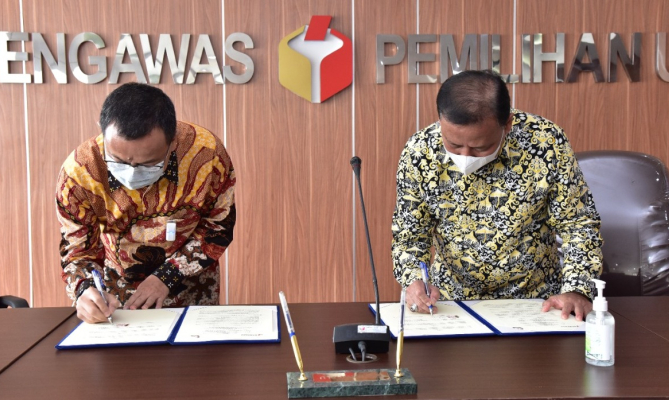 Jakarta, Badan Pengawas Pemilihan Umum- Ketua Bawaslu Abhan bersama Ketua Asosiasi Pengajar Hukum Tata Negara- Hukum Adminstrasi Negara (APHTN-HAN) Guntur Hamzah menandatangani nota kesepahaman antara Bawaslu dengan APHTN-HAN di Gedung Bawaslu lantai lima, Jalan M.H Thamrin 14, Rabu (9/3/2022).