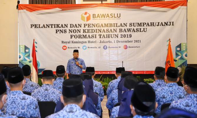 Jakarta, Badan Pengawas Pemilihan Umum - Sekertaris Jenderal (Sekjen) Bawaslu Gunawan Suswantoro melantik 315 calon pegawai negeri sipil (CPNS) formasi tahun 2019 menjadi pegawai negeri sipil (PNS), Rabu, di Jakarta (1/11/2021). Dalam sambutannya, Gunawan menantang para PNS ini untuk melahirkan inovasi terbaru demi kebaikan nama Bawaslu.