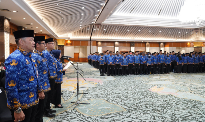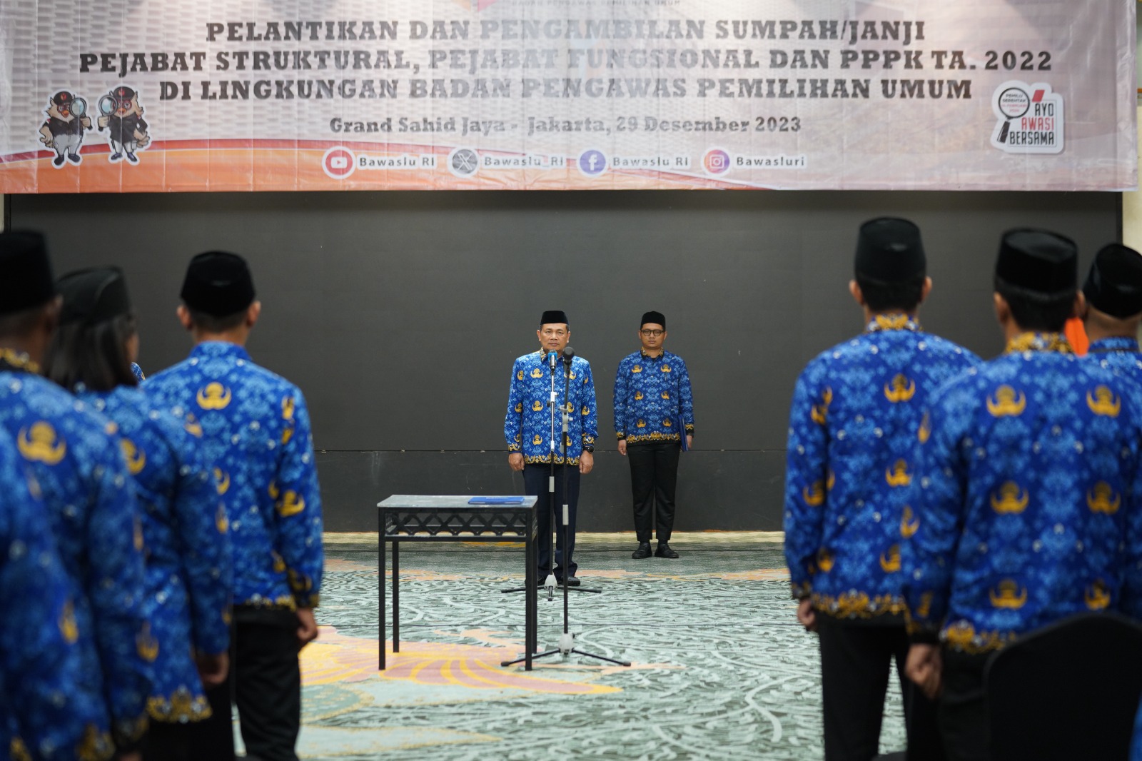 Prosesi pelantikan dan pengambilan sumpah bagi pejabat struktural sebanyak 76 orang, pejabat fungsional 11 orang, dan 580 tenaga PPPK Bawaslu di Jakarta, Jumat (29/12/2023).