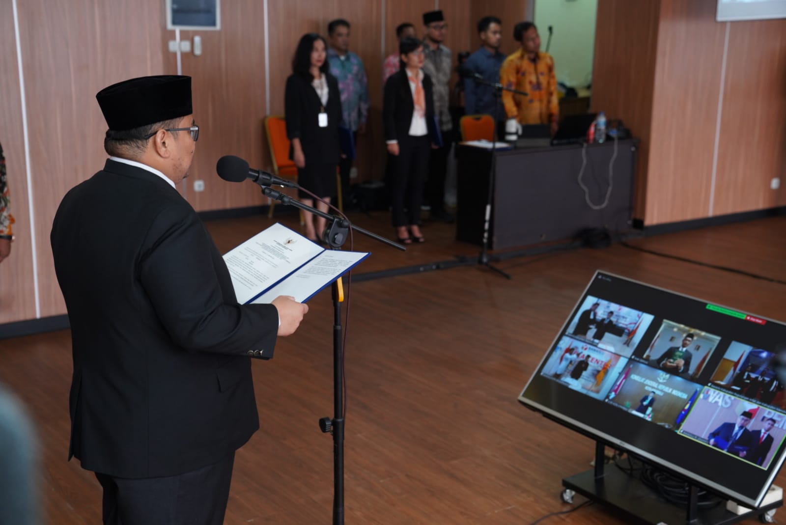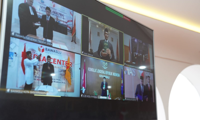 Suasana pelantikan dan pengambilan sumpah atau janji anggota dan penggantian antar-waktu (PAW) Bawaslu Kabupaten/Kota 2023-2028 serta Panitia Pengawas Pemilu (Panwaslu) Luar Negeri (LN) di Kantor Bawaslu, Jakarta secara dalam jaringan (daring) Sabtu (13/1/2024