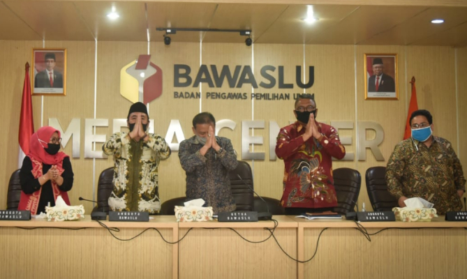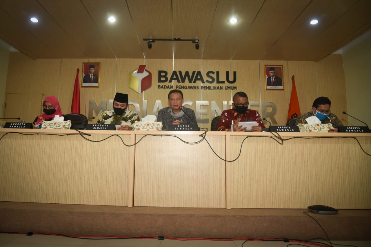 Ketua Bawaslu Abhan (tengah) bersama empat pimpinan Bawaslu lain menggelar jumpa pers terkait hasil pengawasan verfak dukungan perseorangan Pilkada 2020 dan pemutakhiran data pemilih. Foto : Humas Bawaslu RI
