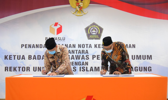 Jakarta, Badan Pengawas Pemilihan Umum - Bawaslu melakukan penandatanganan nota kesepahaman (Memorandum of Understanding/MoU) bersama Universitas Islam Sultan Agung (Unissula) Semarang. Ketua Bawaslu Abhan menyatakan Unissula sebagai lembaga pendidikan akan membantu pengawasan partisipatif dalam penyelenggaraan Pilkada Serentak 2020.