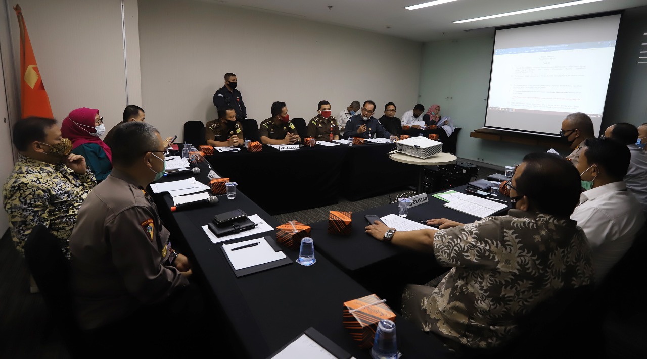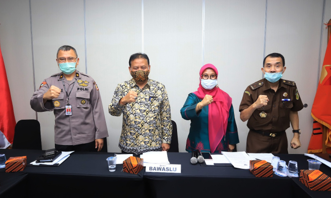 Jakarta, Badan Pengawas Pemilihan Umum – Bawaslu bersama Kepolisian dan Kejaksaan yang tergabung dalam Sentra Penegakan Hukum Terpadu (Sentra Gakkumdu) melakukan kegiatan prapenandatangan dan finalisasi perubahan putusan bersama tentang Sentra Gakkumdu dalam Pilkada 2020. Kegiatan dilakukan di Kawasan Menteng Jakarta Pusat, Senin (13/7/2020).
