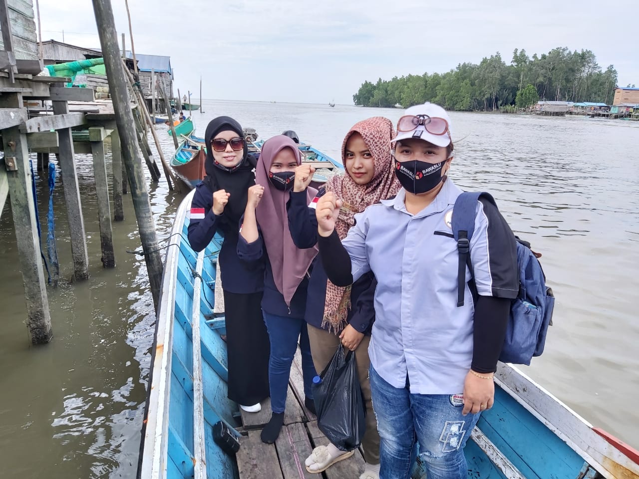 Panwascam Tabalar Lilis Karlina (paling kiri berkacamata hitam) dan tim tengah bergegas pergi menyeberang dengan kapal dompleng ke kampung Tabalar Muara, Berau, Kalimantan Timur untuk melakukan pengawasan coklit Minggu, 2 Agustus 2020. (Foto : Humas Bawaslu Kabupaten Berau)