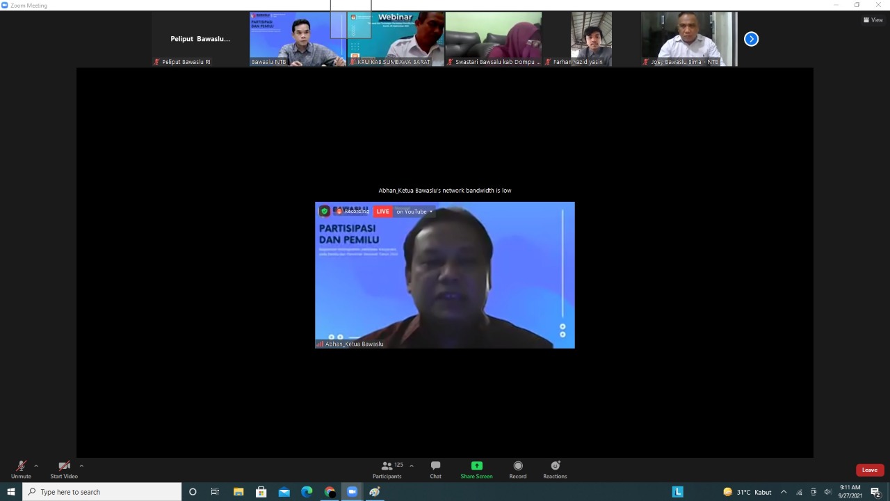 Ketua Bawaslu Abhan saat mengikuti Webinar Nasional Partisipasi dan Pemilu yang digelar oleh Bawaslu Nusa Tenggara Barat (NTB), Senin, 27 September 2021/Foto: Pemberitaan dan Publikasi Bawaslu RI