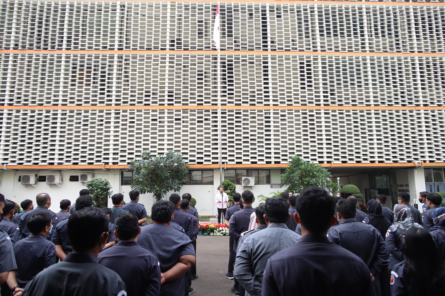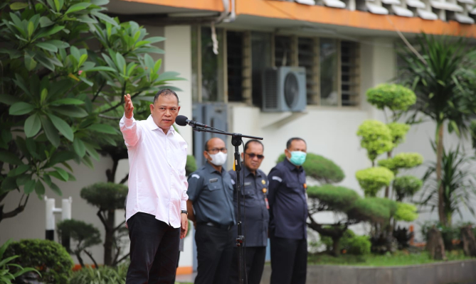 Anggota Bawaslu Totok Hariyono memimpin apel pagi di halaman Gedung Bawaslu, Jl. MH. Thamrin Jakarta, Senin (6/6/2022). (Foto : Publikasi dan Pemberitaan Bawaslu RI)