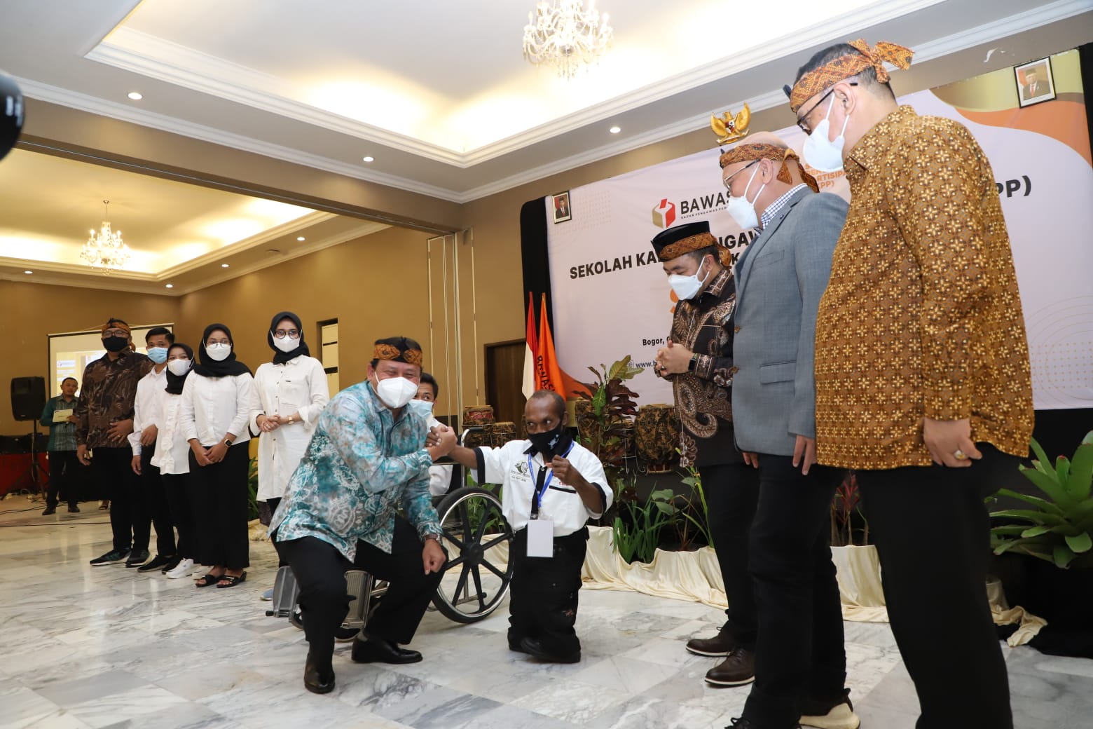 Ketua Bawaslu Abhan (batik warna biru) berfoto dan menyemangati peserta dari kalangan disabilitas dalam pembukaan SKPP Tingkat Lanjut