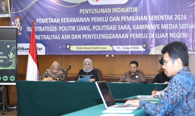 Jakarta, Badan Pengawas Pemiihan Umum - Bawaslu sedang menyusun indikator pemetaan kerawanan Pemilu dan Pemilihan Serentak 2024dengan tema isu strategis yang mencakup lima hal, yakni: politik uang, politisasi SARA (suku, agama, ras, dan antar-golongan), kampanye media mosial, netralitas ASN dan penyelenggaraan pemilu di luar negeri. Anggota Bawaslu Lolly Suhenty menjabarkan, hal ini menjadi antisipasi atas maraknya pelanggaran pada pemilu lalu dan perkembangan yang ada.
