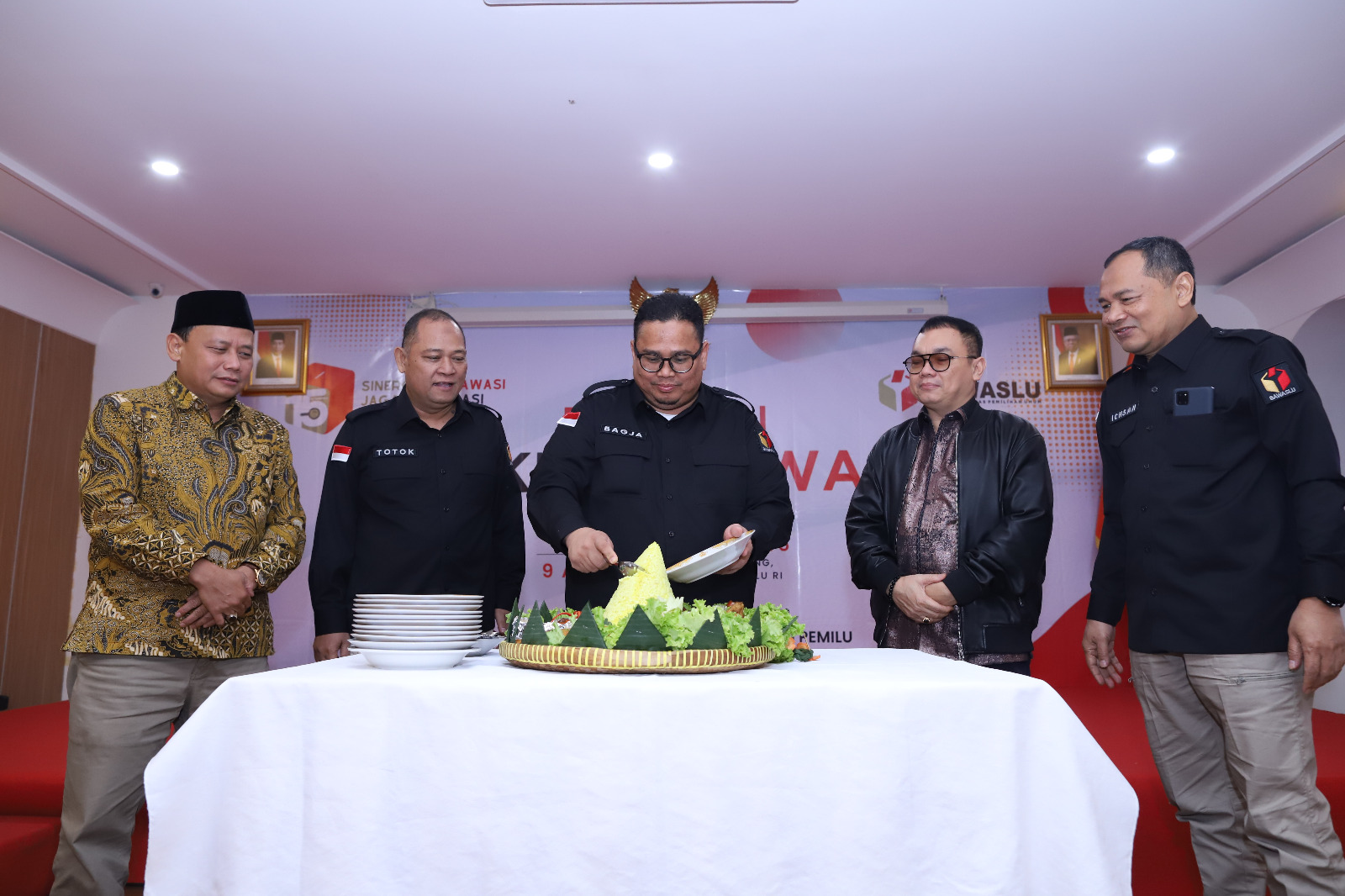 Ketua Bawaslu Rahmat Bagja didampingi Anggota Bawaslu Totok Hariyono memotong tumpeng ada Tasyakuran 15 Tahun Bawaslu, Minggu (9/4/2023).